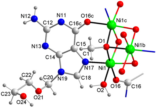 A bluish green parallelepiped crystal of [Ni(μ2-N7,O6-acv-H)(MeO)(H2O)]4·8H2O (1) was mounted on a glass fibre and used for data collection. Crystal data were collected at 100(2) K using a Bruker D8 Venture diffractometer. Graphite monochromated CuKα radiation (λ = 1.54184 Å) was used throughout. The data were processed with APEX2 [18]. The structure was determined by direct methods, using the SHELXS-2013 program [19] and refined by full-matrix least-squares techniques against F2 using SHELXL-2013 [19]. The positional and anisotropic atomic displacement parameters were refined for non-hydrogen atoms. Except for two water molecules, the remaining solvent molecules (observed from the difference Fourier maps) could not be identified because of significant disorder and/or partial occupancy; they were SQUEEZE’d out using PLATON [20]. Final refinement included: (a) the split into two positions for O21, C22, C23, and O24 from the (2-hydroxyethoxy)methyl chain (occupancy factors 0.43(1)/0.57(1)), and (b) bond-length restrains DFIX of 1.50(5) Angstrom’s for each bond of the C20-O21-C22-C23-O24 chain. The problem of disorder around the (2-hydroxyethoxy)methyl chain gave rise to rather elongated ellipsoids for split C23 and O24 atoms. Hydrogen atoms were located in difference maps and included as fixed contributions riding on attached atoms with isotropic thermal parameters 1.2/1.5 times those of their carrier atoms. The large discrepancy between the R and wR values was due to the high thermal vibration present in the (2-hydroxyethoxy)methyl chain of aciclovir and crystallisation water molecules. Nevertheless, the final results can be considered satisfactory from a chemical point of view. The criteria of a satisfactory complete analysis were the ratios of root-mean-square (rms) shift to standard deviation being less than 0.001 and no significant features in the final difference maps. The lowest (−0.36 e·Å−3) and highest (0.58 e·Å−3) peaks in the final difference Fourier map were located close to crystallisation water molecules at 0.67 and 0.14 Angstroms of C23A and H4A, respectively. Atomic scattering factors were taken from the International Tables for Crystallography [21]. Molecular graphics were elaborated with PLATON [20] and DIAMOND [22]. A summary of the crystal data, details of the experiments, and refinement results are listed in Table 1.