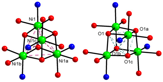 The tetranuclear cluster molecule of 1 is defined by two interpenetrated tetrahedral sets of Ni(II) centres and O1-µ3-methanolate donors, these last atoms being what play the primary role for its construction (Figure 3). Therefore, both the interatomic distances Ni1···Ni1 (3.05 ± 0.01 Å) and O1···O1 (2.70 ± 0.01 Å) are each other reasonably similar. All six faces of this cube have two Ni(II) centres arranged in opposite vertices, which furthermore are peripherally held together by four acyclovirate(1-) anions, displaying the unprecedented and bridging MBP µ-N7,O6(acv-H) (Figure 2). In this case the intermetallic Ni···Ni distance is 3.05 Å (vide supra) whereas the interatomic N7···O6 distance within the acv-H ligand is 3.17 Å.