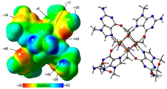 Initially, the molecular electrostatic potential (MEP) surface of compound 1 was computed to analyse the most electron-rich and -poor parts of the molecule (see Figure 5). The MEP maxima are located at the H-atoms of the coordinated water molecules (+49 kcal/mol), followed by the H-atom of the alcohol (+48 kcal/mol). The MEP values at the H-atoms of the exocyclic amino group are significantly less positive (+30 kcal/mol). The MEP minimum is located at the N1-atom (−46 kcal/mol) and is significantly more negative than that at N3 (−34 kcal/mol).