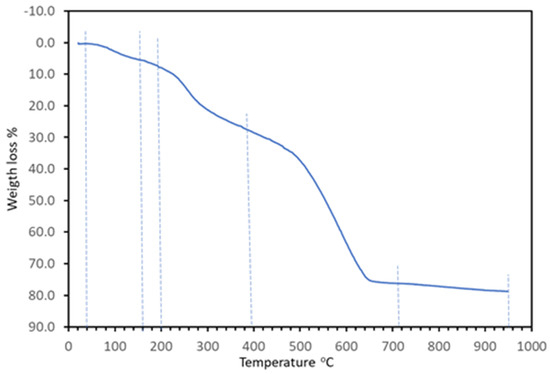 The thermogravimetric behaviour of 1 is shown in the TGA plot (Figure 8), where dashed lines are placed looking at the minima in its first derivative in a routine manner to define the successive steps (see the Supplementary Materials for further description).