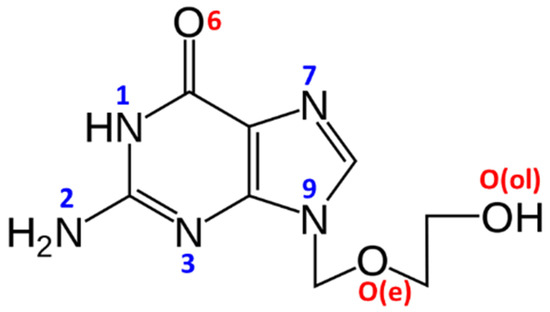 - Birnbaum, G.I.; Cygler, M.; Kusnierek, J.T.; Shugar, D. Structure and conformation of the potent antiherpes agent 9-(2-hydroxyethoxymethyl)guanine (acycloguanosine). Biochem. Biophys. Res. Commun. 1981, 103, 968–974. [Google Scholar] [CrossRef]