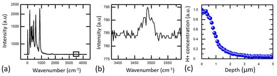 The depth dependence of the concentration of H+ (C(h)) in the sample was measured by confocal Raman microscopy (CRM) with submicron spatial resolution using a confocal Raman microscope Alpha 300 AR (WITec, Germany) with excitation laser on wavelength 488 nm. The measured maximum intensity of the Raman spectrum line 3492 cm−1 corresponding to the oscillations of the OH group was proportional to the concentration of H+ ions [] (Figure 1a,b). Based on the experimentally measured dependence C(h), the depth of the modified layer in our samples was about 2 microns (Figure 1c).