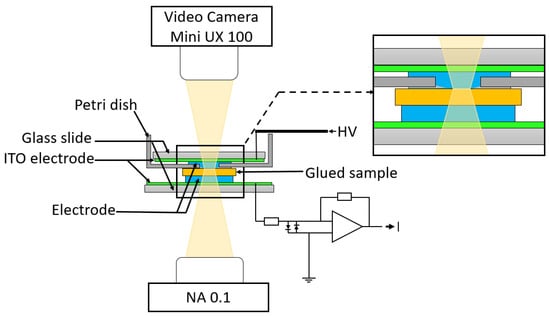 For domain switching, the sample was placed in a cell (Figure 2). Transparent electrodes based on saturated LiCl aqueous solution were used. Switching was carried out in the field range from 1 to 25 kV/mm by applying a single rectangular or triangular pulse with a duration from 100 ms to 300 s. The pulses were generated by an ADC/DAC board PCI-6251 (National Instruments, Austin, TX, USA) and amplified using a Trek 20/20c high-voltage amplifier (Trek Inc., Lockport, NY, USA) (Figure 2). The domain structure was in situ imaged using an LMA10 optical microscope (Carl Zeiss, Oberkochen, Germany) with a FASTCAM Mini UX100 high-speed video camera (Tech Imaging, Saugus, MA, USA) with a recording rate of up to 2500 frames/s.