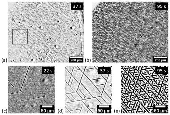 Instantaneous optical images of the domain structure during polarization switching in increasing field. (a,b) At the time interval from the start of field pulse application: (a) 37 s (E = 8 kV/mm), (b) 95 s (E = 19 kV/mm). (c–e) Magnified fragment of the images marked in (a), at the time interval: (c) 22 s (E = 4.5 kV/mm), (d) 37 s (E = 8 kV/mm), (e) 95 s (E = 19 kV/mm). The field growth rate is 0.2 kV/(mm s).