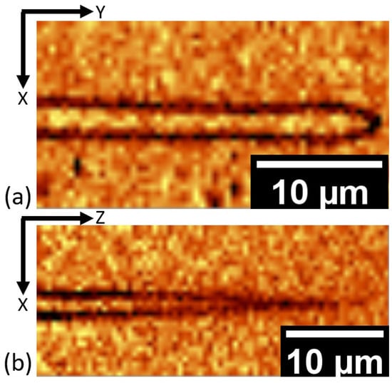 Imaging of the domain structure after partial polarization reversal under the field of 5 kV/mm by the CRM method has shown that the stripe domains have a width of about 4 µm and a depth up to 30 µm (Figure 4).