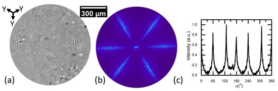 The growth of hexagonal domains was observed in the fields above 21.5 kV/mm, which corresponds to the threshold field for polarization reversal in CLN crystals []. In this case, the domain walls are parallel to the Y crystallographic directions (Figure 7).