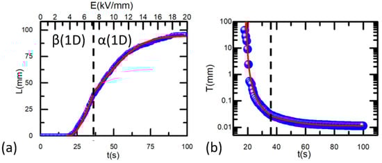 The parameters Lmax = 96 mm, R = 0.2 kV/(mm·s), and Eth = 3.8 kV/mm were fixed during fitting. The values of the best fit parameters are as follows: a = (7.1 ± 0.5)·10−5 mm/(kV·s2), Δt = −(30 ± 1) s, and b = (1.8 ± 0.1)·10−3 s−2.
