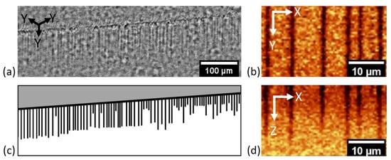 The process of the formation of the quasi-periodic structure of stripe domains after a change in the switching mode was investigated. In this case the switching process consisted of two stages. At the first stage, long flat domain walls were created in a field of 22 kV/mm, and at the second stage, a series of short rectangular pulses with an amplitude of 10 kV/mm and duration of 100 ms with 10 s interval between pulses was applied. Such a switching procedure leads to the formation of a quasi-regular structure of oriented stripe domains that appeared on the flat domain wall and grew along the Y crystallographic direction (Figure 8a,b). The domain width was about 2 μm, and the length—up to 100 μm, the average period—was about 5 μm (Figure 8c). The domain depth measured in the crystal volume by the CRM reached 20 μm (Figure 8d).