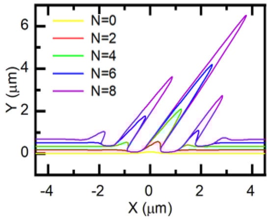 The calculation was performed by the finite element method using the COMSOL Multiphysics software package. The effect of incomplete compensation of the bound charge on the surface behind the moving domain wall was taken into account. The local electric field on the domain wall was calculated at a depth of 400 nm. The change in the wall shape as a result of the application of the field pulse was obtained from the field dependence of the wall velocity according to Equation (2). Iterative calculation of the local field distribution and inhomogeneous domain wall shift made it possible to obtain the change in the wall shape during switching by a series of pulses. It is shown that quasi-periodic structures of ledges (stripe domains) are formed at the domain wall (Figure 9). The field decrease in the valleys between the ledges below the threshold ensures the existence of stable concave angles [].