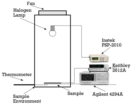 The sample was placed inside an insulated dark box, the temperature of which was controlled by a fan and a thermometer. The light beam was emitted by a tungsten halogen lamp powered at a constant current of 8.3A (100 W) using an Instek 2010 PSP-2010 power supply. Current-to-voltage scans were performed using a Keithley 2612A source meter. Sample impedance was measured using an Agilent 4294A Precision Impedance Analyzer. All the measurements were made at room temperature and were performed inside the dark box in conditions of dark and light illumination (4450 lux).