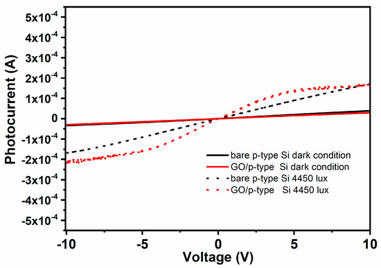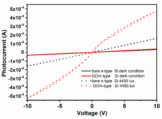 As can be seen in Figure 5, the I–V characteristics show that the photocurrent of the GO/n-type Si samples more than tripled in comparison to bare n-type Si samples under light illumination.