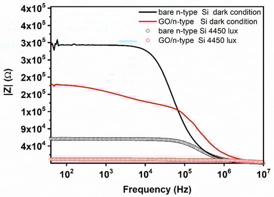 In Figure 7, the impedance of GO/n-type Si samples decreases in both the absence and presence of light radiation. The conductivity is quintupled for GO/n-type Si samples in comparison to bare n-type Si under light conditions.