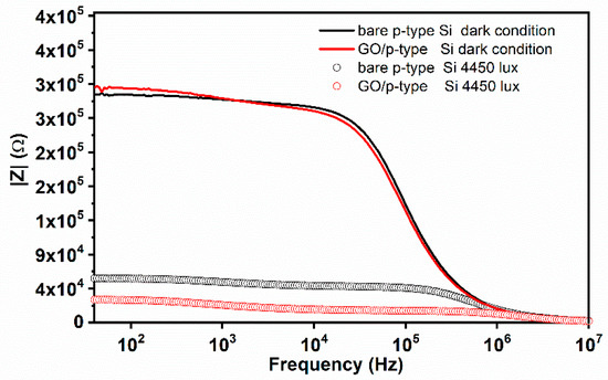 As shown in Figure 8, the p-type silicon and GO/p-type Si samples have the same impedance behavior in dark conditions. In the presence of light radiation, there is an increase in GO/p -type Si conductivity in comparison to bare p-type Si.