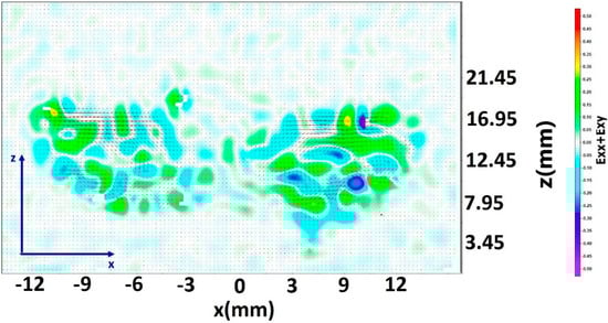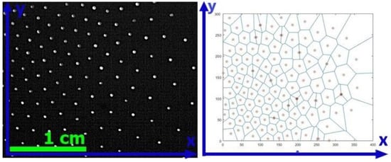 For the region of the two vortices, a brief analysis of the divergence of the velocity field shows values close to zero. We know from the equation of continuity [24], , that incompressibility is achieved when the divergence is zero. We can see from Figure 4 how the divergence values are slightly different from zero. Taking into account the values for divergence near to zero on the region of the two vortexes and the stable central area analyzed by the Voronoi diagram, it can be considered that in this dusty plasma the crystalline and the liquid phases coexist together. A similar situation was reported [5,25] in an argon plasma with spherical microparticles, with the difference that the liquid state was obtained by melting the crystalline structure by varying the discharge current. Other experiments [26] with thermal plasmas (1700–2200 K) confirm the mixture of states and the phase transition through melting.