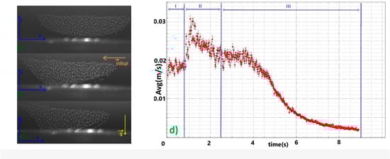 Initially, the crystal stays in place and the vortices rotate with constant speed and vorticity at a pressure of 250 mTorr and an electric power of 2 W. After introducing the gas into the vacuum chamber at constant speed through the gas valve, we observe the collective displacement of the particles in the crystal in the direction of gas propagation. The shift of the particles is in the direction of gas flow that we see in Figure 5b,c. In Figure 2 and Figure 5, the movement of the crystal is along the x axis, more precisely from +x to −x. Gravity acts in the direction of the −z axis. For this reason, it is reasonable to assert that the crystal displacement is done by pushing the neutral gas particles. The crystal shift also involves a change of its shape, especially at the level of the two vortexes. One vortex was stretched, and the other was compressed. In Figure 5, we can observe three phases associated with evolution of the crystal. The displacement of the crystals takes 2.5 s, and then the particles fall to the down electrode. Three regions of the speed of the crystal vortexes can be identified. In Figure 5d, a significant increase in average rotational speed can be observed from the moment the crystal is displaced up to twice the initial speed.