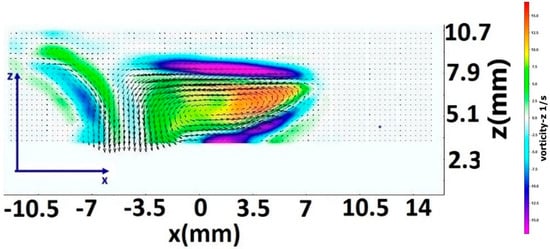 A short PIV analysis [33] shows that in the first phase the vorticity of the flow field, , is not constant like in the case of a rigid rotating disc, but it shows a gradient of vorticity with values of 2 to 14 s−1 (as in Figure 6a). The highest values of vorticity can be seen in center of the vortexes. In the edge regions of the crystal, a strong velocity shear in the form of narrow islands situated above and below the vortexes can be seen. Initially, after the neutral gas pushing force displaces the crystal, we can observe an increasing value for the central vortex and edge vortexes from 12–14 s−1 to 17–20 s−1 (Figure 6b). This increase in vorticity can be attributed partially to the dissipation of the energy of the pushing force of the neutral gas. Additionally, the stretching and compression phenomena of vortexes associated with the increasing vorticity can be related to the Kelvin–Helmholtz instability. After 3.25 s, the maximum vorticity of both vortexes drops to 2–6 s−1 for the central region and to 16 s−1 for the narrow island of the stretched vortex (Figure 7). The decrease in vorticity after a few seconds can be attributed to a higher density of the neutral gas introduced into the chamber, which makes the friction with the neutral gas greater. A similar effect was reported in [34]; however, the cloud of particles from the DC plasma increased its width with increasing pressure. In our experiment, the dimension of the dusty plasma system remains almost constant by increasing the gas pressure up to 700 mTorr.