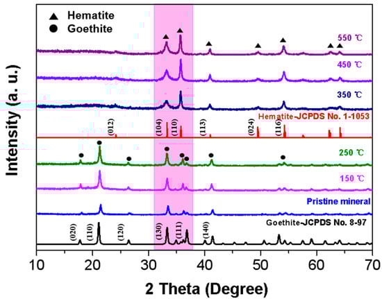 The XRD patterns of goethite and its calcined products are shown in Figure 1. All peaks of the pristine mineral were identified as goethite with no impurities by comparing with the standard pattern (JCPDS No. 8-97), which was consistent with the XRF results (Table S1, Supplementary Materials) showing that the content of iron oxides existed in the form of goethite was as high as 95.95%. When the calcination temperature was varied from 350 to 550 °C, the peaks of goethite disappeared, and new characteristic peaks appeared, which were identified as hematite. The intensity of the peak increased with increasing temperature. According to the peak intensity of the standard diffraction pattern JCPDS No. 1-1053, it indicated that after calcination at a temperature above 350 °C, the obtained hematite had a preferred development of (110) facets indicated by a sharp diffraction peak, which could be seen in the pink area in Figure 1. This was also consistent with the exposed crystal facet in the literature [19]. The grain size determined from the (110) facet was much larger than that from the other facets by calculating with the Scherrer formula (Table S2) [35]. This indicated that perhaps the hematite formed after calcination exposes the (110) facet. In addition, the diffraction peak intensity of this facet gradually increased when we prolonged the calcination time, and the hematite crystal grains grew along the c-axis (Figure S2, Supplementary Materials).