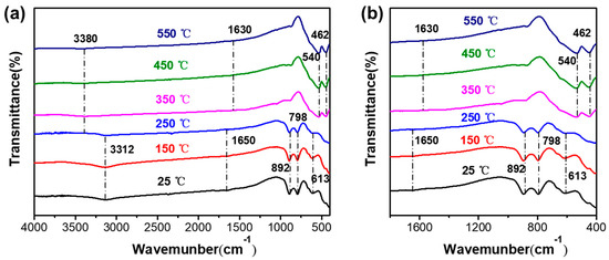The FT-IR spectroscopy of pristine goethite and the calcined products of goethite at different temperatures for 1 h. (a) all spectrum, (b) regions of 1800-450 cm−1.