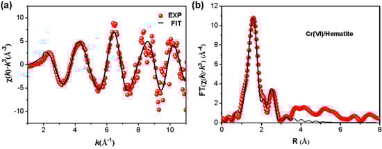 The k3-weighted K-edge EXAFS spectra (a) of Cr (VI) on hematite show the fit (solid black line) of the theoretical curve to the experimental curve (red spheres). Fourier-transformed spectra (b) of Cr (VI) adsorbed on hematite resulting in a radial structure-function. The peak positions correspond to the distances of the atomic shells but are uncorrected for phase shifts.