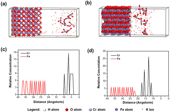The radial distribution of Cr and Fe can be simulated with software. The study of the arrangement of Cr, goethite, and hematite was based on Fe representing iron (hydr)oxide and Cr (central positive group in K2Cr2O7) representing K2Cr2O7, with the results shown in Figure 6c,d. Initially, goethite was located at 22~37.5 Å, while arrangements of Cr stayed at 3.5~8 Å and 9~10.3 Å. Hematite was located at 21.7~38 Å, while arrangements of Cr stayed at 11~14.2 Å and 15.3~18 Å. When goethite was calcined, the distance between chromium and goethite was longer than between chromium and hematite. This means the phase transition resulting from calcination strongly affects locations of Cr and thermal modification renders a shorter distance of Cr to hematite, indicating stronger interaction.