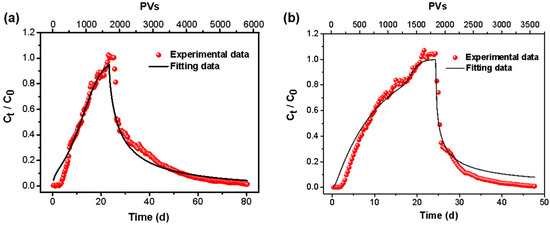 The Cr (VI) solute transport behavior and breakthrough curves were shown in Figure 7a,b. At an initial concentration of 5 mg/L and 20 mg/L, the columns reached saturation after continuous operation for 552 h and 502 h, respectively. When Ct/C0 = 0.5, the number of PVs was about 871 for a column with an initial concentration of 5 mg/L and 610 PVs for 20 mg/L. The HYDRUS-1D solute transport model was used to fit the Cr (VI) transport results through hematite columns under different conditions. The hematite had a dispersion of 23 cm under the initial concentration of 5 mg/L and a dispersion of 2.6 cm under the input concentration of 20 mg/L, and the coefficient of determination R2 was 0.95 and 0.99, respectively, when the experimental data were fitted by the software HYDRUS-1D (Table 2). Compared with the higher adsorption capacity in the batch experiment, the adsorption capacity in the column experiment at different input concentrations was 2.67 and 1.3 mg/g, respectively. There were two main reasons for the smaller adsorption capacity of the column experiment.