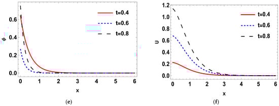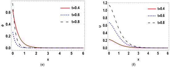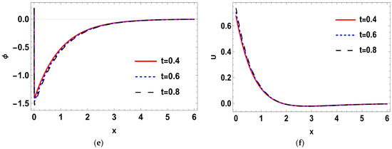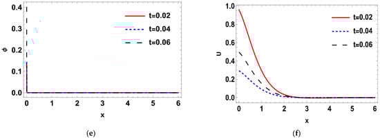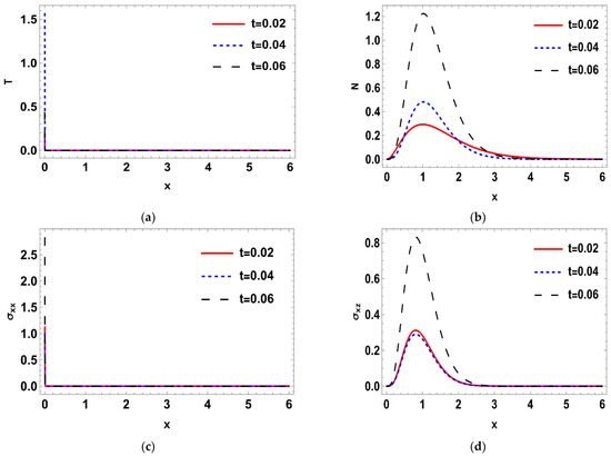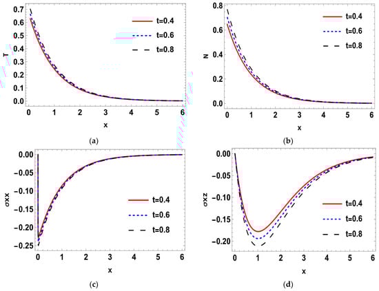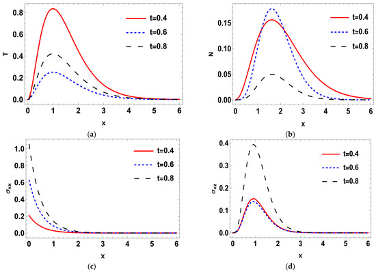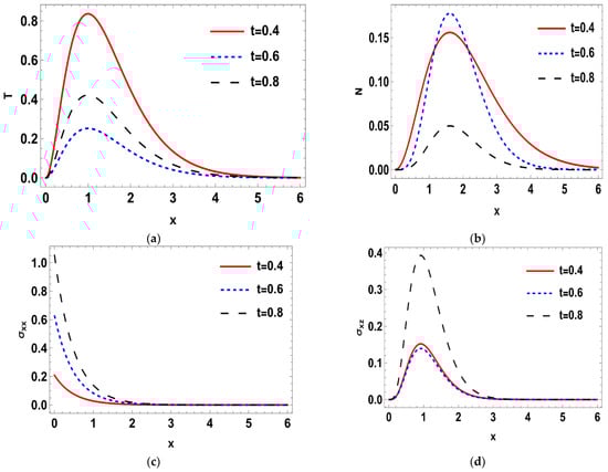 (a–f) The variance of temperature, normal stress, carrier density, displacement and heat conduction distributions around its mean at different values of times t = 0.2, and when .