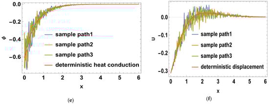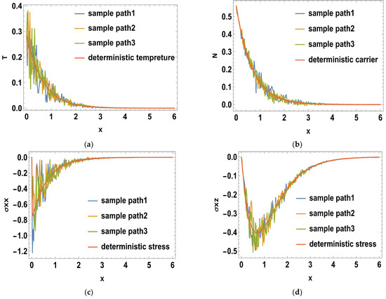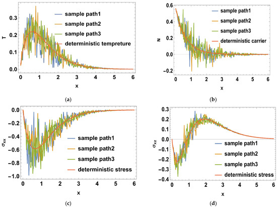 (a–f) The deterministic and stochastic distributions of temperature, normal stress, carrier density, displacement and heat conduction distributions along the distance at in relation to generalized photo-thermoelasticity theory, when .