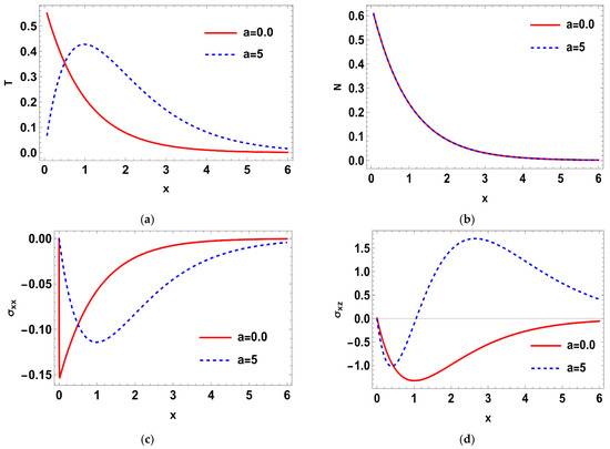 Such that where is the imaginary part, and for a short time, the real part, was taken. The calculations were performed for three values of time, namely: , , and Normal mode method was used to get the solutions of the distribution of the thermal temperature , Carrier density N, the stress () distribution, heat conduction , and the displacement components . The problem was described in 2-D and in non-dimensional form. Figure 1a–d shows the difference in the deterministic case of the physical quantities in three different times namely, at when . It is notable that the wave of all physical quantities behaves in the same manner but differ a bit in the magnitude. In Figure 1a, the deterministic distribution of the temperature begins from a lowest point then becomes greater towards the maximum, then becomes less smooth as x-axis increases until it matches the zero line. In Figure 1b, the deterministic carrier density distribution starts from the peak, then goes down till it matches the zero line. In Figure 1c,d, it is noted that the stress distributions () agree with the boundary conditions which start from zero, then decrease a little after a short distance, then begin to raise again until coincide with zero line. In Figure 1e,f, it is noted that the heat conduction and the displacement components take the same distribution as a wave, but differ in terms of amplitude. The displacement component still goes up to the positive part, but the heat conduction remains at the negative part. Figure 2a–f. shows the disparity between the deterministic and stochastic distributions of temperature, normal stress, carrier density, displacement, and heat conduction distributions versus x-axis at when . It is noted that, in all distributions, the intensity of the white noise looks very strong at first, then begins to get weak with the increasing of the distance. Finally, it coincides with x-axis. These findings (the deterministic results) are consistent with what has been shown in real-world experiments [44,45]. Figure 3a–f, display the variance of temperature, normal stress, carrier density, displacement, and heat conduction distributions around its mean at different values of times, namely when . Figure 3, especially Figure 3a,b,d, represents the variance of the thermal wave of temperature, carrier density and the stress distributions, respectively. It is noted that they act similarly as they begin from zero, and then take pyramidal shape as a wave but in a different size, then decrease to coincide with the zero line. Figure 3c,e,f, represent the variance of the stress , heat conduction, and displacement distributions respectively. They also take the same behavior as they begin from the peak and then decrease smoothly till match the x-axis. Figure 4a–f, shows the deterministic temperature, normal stress, carrier density, displacement, and heat conduction distributions along the distance for various values of times, namely when . It is noted that all distributions match the boundary condition, as they begin from a maximum or minimum point, then decrease or increase in a smooth way, except the stress and heat conduction distributions; as they decrease sharply not smoothly, then coincide with x-axis. Figure 5a–f, display the deterministic and stochastic distributions of temperature , normal stress , carrier density , displacement and heat conduction distributions along the distance at when . It is noted that they agree with the boundary condition and the strength of the random function begins very strong, then weakens with the increasing of x-axis until it vanishes. Figure 6a–f, shows the variance of temperature , normal stress , carrier density , displacement and heat conduction distributions around its mean at different values of times when . Figure 6a,c,e represent (the temperature , normal stress and heat conduction distributions), respectively. It is noted that it takes the same shape as a wave, beginning from the peak, then dropping sharply to the lowest point and coinciding with x-axis. Figure 7a–f shows the effect of the two-temperature parameter {a}. In order to show the effect of two-temperature parameter {a}, a comparison between the temperature , carrier density N, stress and , heat conduction and displacement distributions was performed in two different values of two-temperature parameter, namely and . It is noted that, when , the curves of temperature , carrier density , and displacement distributions begin from a maximum point, then decrease smoothly till coincide with x-axis. On the other side the curves of stress, and , heat conduction begins from a maximum point, then decreases sharply, then increases again smoothly till coinciding with the zero line. It is noted that, when , the curves of the temperature , the stress (, ) and displacement distribution begin from a minimum point then increase smoothly till coinciding with x-axis, but the carrier density N and the heat conduction distributions begin from a maximum point, then decrease smoothly till coinciding with x-axis. From Figure 7a–f, it is noted that the increase of the two-temperature parameter leads to the increase of its magnitude for all physical quantities, except for the displacement distribution. Taking into account the increase in the time of deterministic behavior is more realistic than the stochastic behavior, and physically acceptable as well as consistent with the experimental results implemented by Xiao et al. [44]. The thermal wave (temperature) and plasma wave (carrier density) behavior are compatible with those of the experiments specified in the subfigures of temperature and carrier density distribution [45].