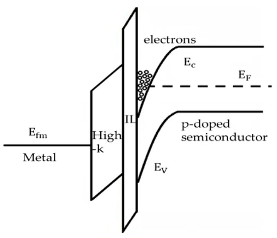 Let us have a multi-layer model structure (Figure 1) where the region z ≤ −(L + D) is occupied by the gate metal, the region −(L + D) < z ≤ −L is filled by the dielectric oxide layer of thickness D and dielectric constant , the region −L < z ≤ 0 is filled by the dielectric passivation inter-layer (IL) of thickness L and dielectric constant , and finally the region 0 < z ≤ ∞ is occupied by the semiconductor with the dielectric constant and the dotted line here represents the inversion channel boundary. Here, the z axis is perpendicular to the gate layer interfaces. In order to offer more visibility in Figure 2, the band vending diagram of the discussed structure is also given.