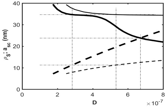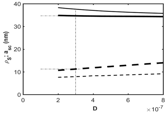 As for the oxide thickness values of D > 4 nm, as shown in Figure 3, for the ll-κ-type structure with the condition εs > >εD (the low-κ oxide), the effective radii react quite differently to an increase in D. In case (a), the asc graph starts to decrease noticeably, indicating a significant enhancement of the impurity Coulomb interaction at the required distances. This is due to the growing influence of dielectric polarization in the low-κ oxide layer, and parallel with that, a weakening of the metal layer induced polarization with increasing D. These two positive factors of impurity interaction enhancement outweigh the influence of the ES mechanism at these distances. In these conditions, the effective screening parameter qs* behaves as asc, so the ρs graph increases noticeably. This situation is also favored by the ES mechanism’s insignificance according to the condition following Equation (22). At the same time, the rate decrease of the asc graph is much slower (≈22%) than the high growth rate of the ρs ≈ qS*−1 graph (≈83%). In case (b), for which the condition following Equation (23) is no longer satisfied, the asc values become almost saturated again, as for the D < 4 nm oxide thicknesses, and the ρs growth rate also persists (≈85%). The reason for such results is the strong influence of the EC mechanism, the action of which now outweighs the contribution of dielectric enhancement to the impurity interaction.