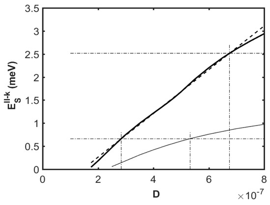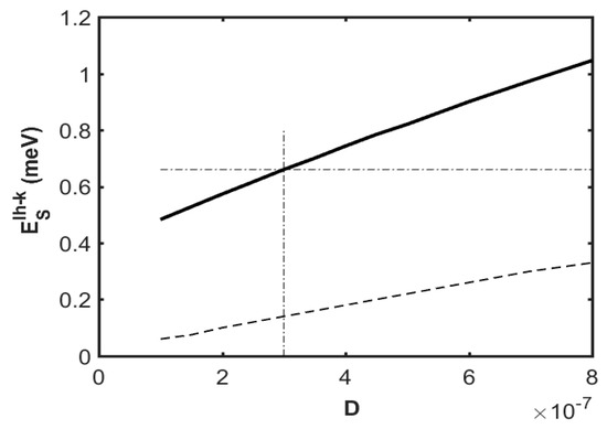 At the same time, the binding energy D dependence linear-like growth is more visible in Figure 6 both in cases (a) and (b) at the oxide thickness range D ϵ (3–7 nm). Here, in the first case, Eslh-k remains sizable starting from D > 3 × 10−7 nm (marked by a vertical dashed-dotted line in the figure), while the second case takes tiny values for the entire discussed interval D ϵ (2–8 nm). Such a pattern is wholly consistent with the long-range nature restriction of the Q2D impurity interaction potential due to the high-κ dielectric mismatch effect. In this regard, it should be emphasized that the still sizable values of the binding energy in case (a) are also conditioned by the favorable parameters of the low-k type passivation layer.