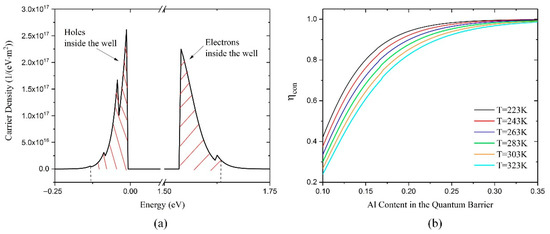 Simulated carrier confinement efficiency model: (a) the carrier concentration distribution with energy level for In0.14Al0.14Ga0.72As/Al0.25Ga0.75As quantum well at 223 K (b) carrier confinement efficiency vs. Al content of the quantum barrier at different temperatures.