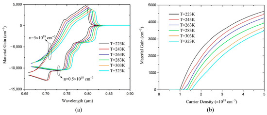 The gain spectrum curves are shown in Figure 2. When the carrier concentration in the quantum well was 0.5 × 1018 cm−3, meaning the injection current was lower than the threshold current, the material gain was negative. When the carrier concentration increased to 5 × 1018 cm−3, the material gain at the lasing wavelength was positive and lasing occurred. In addition, as the temperature rose, the peak material gain gradually decreased, and red shifts of the lasing wavelength were observed. Figure 2b is drawn with the peak gain as the Y-axis to better illustrate the relationship between material gain, temperature, and carrier concentration. As the temperature rose from 223 to 323 K, the slope of material gain gradually decreased, and the transparent carrier density gradually increased from 0.98 × 1018 to 1.54 × 1018 cm−3, indicating the weaker gain capability of the quantum well.