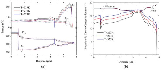 Temperature effects in the epitaxial direction at an injection current of 10 A (a) energy band structure (b) carrier concentration (the position of 0 μm is located at the start position of the N-buffer layer, while the ordinate of Figure 3a has a break range from 0.4 to 1.6 and the ordinate of Figure 3b is logarithmically transformed by 10).