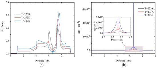 The electric resistivity and free carrier absorption intensity are important indicators that affect the voltage and output power of the device. These two values will also be affected as the temperature changes the distribution of carrier concentration, as shown in Figure 4. The free carrier absorption intensity is defined as follows [23],