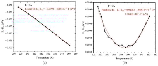 Figure 5 illustrates the position of the electron and hole Fermi energy levels in the quantum well at various temperatures. The electron Fermi energy level was approximately linear with temperature when the injection current was fixed at 10 A, and the fitted result was Ec − EFe = −0.0192 − 1.828 × 10−4T (eV). The hole Fermi energy level was approximately parabolic with temperature, and the fitted result was Ev − EFh = 0.02362 − 1.03878 × 10−4T + 1.78482 × 10−7T2 (eV).