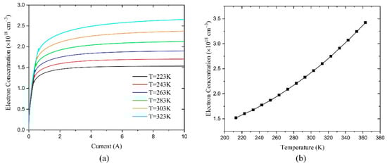 The carrier concentration in the quantum well was clamped over the threshold; however, this clamped state was shifted by the temperature, as shown in Figure 6, which implied a nonlinear relationship between the threshold carrier concentration and temperature. The threshold carrier concentration increased exponentially from 1.60 × 1018 to 2.75 × 1018 cm−3 when the temperature rose from 223 to 323 K.