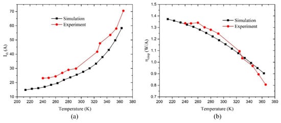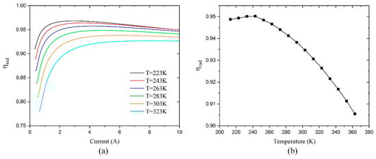 According to Equations (1) and (2), the carrier confinement efficiency needs to be combined with the radiation recombination efficiency and internal loss to determine the slop efficiency. Therefore, in order to compare the simulated and experimental data, the temperature effects on the radiation recombination efficiency and the internal loss were simulated in this section.