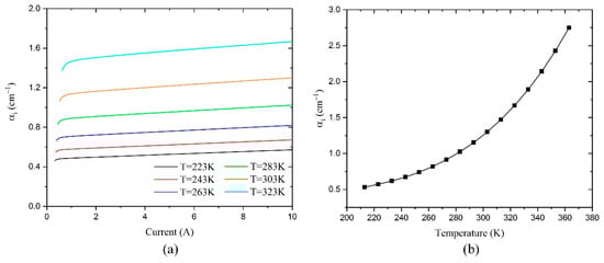 where represents the scattering loss and is the free carrier absorption intensity defined in Equation (10). It can be estimated that the internal optical loss did not change significantly with the injection current after reaching the threshold current. The internal optical loss increased exponentially from 0.57 to 1.67 cm−1 as the temperature rose from 223 to 323 K. According to Equation (9), the threshold material gain has to increase since the optical confinement factor of the quantum well hardly changed with temperature. In summary, the material gain ability gradually weakened as the temperature increased, so the carrier concentration in the quantum well needed to increase, resulting in a corresponding increase in internal optical loss. Finally, increasing the carrier concentration in the quantum well is needed to achieve the new threshold gain condition, forming a vicious circle and causing the carrier concentration in the quantum well to increase exponentially. This is an important reason for the rapid decline in the performance of semiconductor lasers at high temperatures.