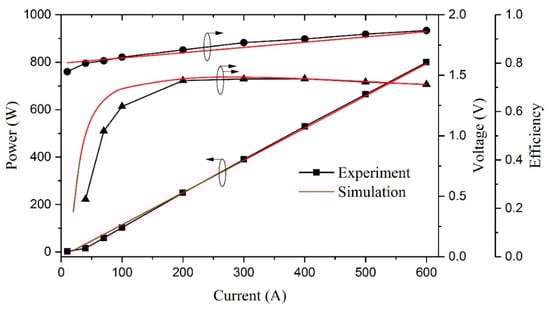 Figure 9 shows the output power, injection current, and applied voltage (L-I-U) characteristics of the laser bar at 223 K compared with simulated values, which were deduced from the single-emitting simulation multiplier. According to the experimental results, the output power of the bar reached 799 W when the injection current was 600 A, while the electro-optical conversion efficiency was 71.2%. The device reached the maximum electro-optical conversion efficiency of 73.5% when the injection current was 400 A. The simulated and experimental results were highly consistent, indicating that the theoretical model we used in Section 2 and Section 4 accurately anticipated the performance of high-power semiconductor lasers.