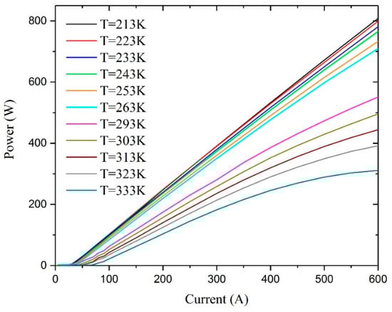 The output power-current (L-I) curves ranging from 213 to 333 K are shown in Figure 10. The L-I curves showed an obvious linear relationship below a heatsink temperature of 273 K, with the slope efficiency rising from 1.25 W/A at 263 K to 1.34 W/A at 223 K. Additionally, the temperature effects of rising power were saturated below 213 K when the carrier leakage was almost negligible. The threshold current was increasing rapidly above a heatsink temperature of 293 K, from 41.7 A at 293 K to 70.5 A at 333 K, and the slope efficiency decreased significantly, from 1.09 W/A at 293 K to 0.81 W/A at 333 K. The output power dropped from 808 W at 213 K to 311 W at 333 K when the injection current was 600 A, with a difference of 497 W, meaning the device was only suitable for low temperatures.