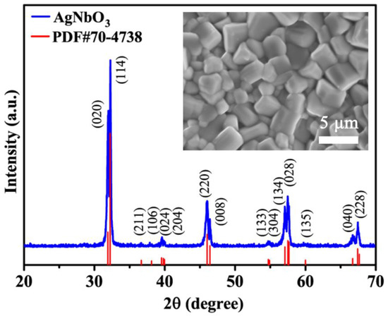 The XRD pattern of the sintered AgNbO3 ceramic in the range of 20~70° is shown in Figure 1. A single phase assigned to an orthorhombic perovskite structure was achieved (JCPDS Card No.70-4738), which was consistent with results reported previously [33]. It is worth noting that an antipolar M1 (Pbcm symmetry/AFE) phase and a polar M1 (Pmc21 non-centrosymmetry/FE) phase coexist at room temperature [34,35,36]. SEM images of the AgNbO3 ceramic are presented in the inset of Figure 1. The grains of the ceramics developed satisfactorily, resulting in a dense and cubic microstructure. The grain size was in the range of 2~4 μm and the density of the ceramic was 6.565 g·cm−3 representing 96% of the theoretical density. The results indicate that a high breakdown strength (BDS) was achieved, contributing to the large obtained polarization value.