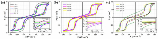 The temperature dependence of the P-E loops collected at 180 kV cm−1 was evident during the heating process, as shown in Figure 3a–c. In order to unambiguously reveal the variation in the P-E loops at different temperature stages, the results were divided into three temperature segments. For the temperature stage from 30 °C to 110 °C, the Pmax value monotonically decreased with increase in temperature, while the EF showed an upward trend. For the temperature stage from 110 °C to 170 °C, Pmax monotonically increased with temperature increase, while EF reduced. When the temperature was above 170 °C (>Tf), the Pmax value monotonically decreased again with increase in temperature, while the EF again showed an upward trend compared with that for P-E at 170 °C. It was observed that there was an opposite trend in the changes between Pmax and EF at different temperature stages, which further reinforced the complexity of the structure in the AgNbO3 AFE ceramics.