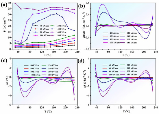 where Cp is the heat capacity, ρ is the density of the samples, T is the operating temperature, P is the maximum polarization at an applied electric field E, and E1 and E2 are the initial and final applied electric fields. The values of were obtained from sixth-order polynomial fits to the raw Pmax-T data extracted from the upper branches of the P-E loops for E > 0. ρ is the density of the AgNbO3 ceramics (6.565 g·cm−3). The heat capacity Cp was selected to be 0.33 J·g−1·K−1 at room temperature. The profiles of ΔT and ΔS versus temperature (ΔT-T and ΔS-T) under different electric fields were calculated according to Equations (1) and (2), as shown in Figure 4c,d. It was found that a positive and negative ECE were achieved over a broad temperature range of 30~230 °C. In particular, a large negative ECE (−4.38 °C under 180 kV cm−1 at 65 °C) was obtained in the ambient temperature range with a broad temperature span, which contributed to a large dP/dT (>0) and large entropy change (|ΔS|~4.4 J mol−1 K−1 in Figure 4d) in this temperature range. In addition, a positive ECE (2.3 °C under 180 kV cm−1 at 210 °C) was also obtained under a high electric-field (>EF) in the temperature range from 170 °C to 230 °C. As previously mentioned with respect to Figure 3, it should be noted that the ferroelectric state dominated the system at this temperature stage when EF > 140 kV cm−1; therefore, the decrease in the polarization value with increase in temperature caused the appearance of the positive ECE owing to negative dP/dT, which was consistent with normal ECEs observed in FE materials [39,40]. Overall, a positive and negative ECE in the lead-free silver niobate AFE ceramic was obtained. However, the deeper ECE mechanisms of AgNbO3 lead-free AFE ceramics need to be explored in the future.