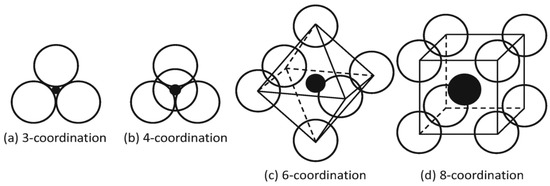 In crystals, atoms are circled by several atoms. Coordination is defined by atomic size and bonding axis. Several coordination systems with ionic radius and bonding orbital are depicted in Table 3. Coordination numbers are tri (3), tetra (4), octal (6), and cubic (8). The number 12 defines the close packing arrangements.