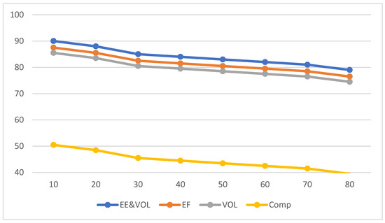 Figure 5 depicts the compared models’ accuracy versus the ratio of the test dataset to the whole dataset. The performance metrics utilized are recall, precision, and F-score, and, compared to the test ratio, depict trends similar to the classification accuracy. All models are constructed on crystal structures. Nevertheless, the accuracy of the transfer learning models is higher than the model without transfer learning. With 90% of the dataset used for training and 10% for testing, the model using MapEE&VOL can attain an accuracy of 90%, while the model without transfer learning using Mapcomp only attains an accuracy of 55%. The accuracy percentage of the transfer learning is unaffected by the training/testing ratio. When the test data rise from 10% to 50%, the accuracy declines from 90% to 86%. The model using MapEE&VOL depicts the highest accuracy percentage because it uses features from both selection phases.