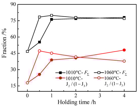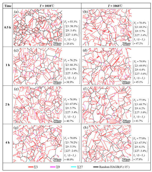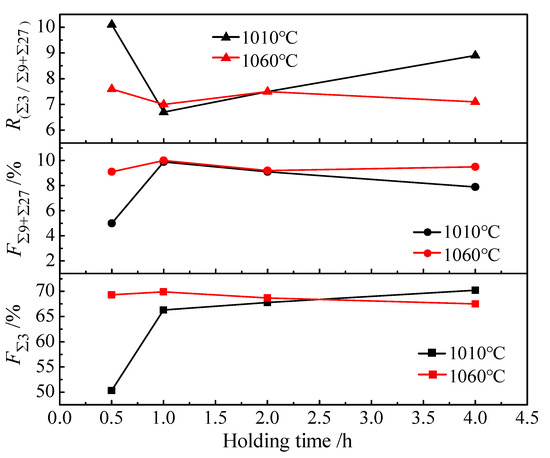 Figure 6 shows the variation of length fractions for Σ3n boundaries (Σ3, Σ9 + Σ27 and Σ3/(Σ9 + Σ27) ratio) at different annealed specimens. It can be seen that the FΣ3 value gradually increased first and then tended to be stable with the extension of holding time at both 1010 °C and 1060 °C, which present the same evolution pattern with the FΣ in Figure 5, demonstrating that Σ3 is the main part of Σ3n boundaries. The values of FΣ9 + Σ27 and RΣ3/(Σ9 + Σ27), however, showed different patterns at the two temperatures. For the annealing temperature of 1010 ℃, FΣ9 + Σ27 first increased to about 9.9% (holding for 1 h) and then slowly decreased, but the change of RΣ3/(Σ9 + Σ27) showed an opposite trend. They reflect that both the new twinning mechanism and Σ3 regeneration mechanism contribute to the proliferation of Σ3n boundaries at the initial stage of annealing, and with increasing annealing time, the new twinning mechanism gradually becomes the dominant mode. Furthermore, it is found from the morphology of Σ3n boundaries shown in Figure 2 that the Σ3n boundaries formed at the initial stage of annealing mainly presented a multi-step curved shape and short size, and with the increase in annealing time they gradually adjusted the morphologies for evolving into larger Σ3 boundaries and interconnected chains or clusters. Moreover, some Σ9, Σ27 and RHAGB in the GB network gradually transformed into Σ3 boundaries. That is, the GBCDs was further optimized, as demonstrated in Section 3.1.