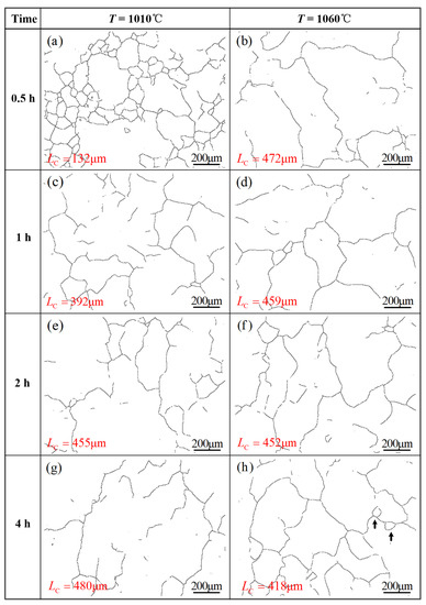 In contrast, under the solution annealing condition of 1060 ℃, the TRDs with relatively uniform distribution (Figure 2b) and large size (472 μm (Figure 3b)) formed after holding for 0.5 h, and the FΣ and J2/(1 − J3) almost reached their maximum values of 78.4% and 47.2%, respectively. These results of GBCDs are all close to the GBCDs after solution annealing at 1010 °C for 4 h. With the increase in holding time, LC and J2/(1 − J3) values decreased slowly, presenting an opposite trend to that of annealing at 1010 ℃, as shown in Figure 4 and Figure 5. The FΣ value, however, gradually stabilized at about 77.0%, which was basically consistent with that annealing at 1010 °C for a long time (Figure 5). From the corresponding microstructure, Figure 2d,f,h and Figure 3d,f,h, it can be seen that in the annealing process of 1–4 h, the TRDs with small size (as indicated by black arrows in Figure 3h) appeared again in local areas, and some interconnected RHAGB formed around them. They reflect that during this process the new recrystallization nucleation has occurred in the local area and promoted the formation of relatively fine grains.