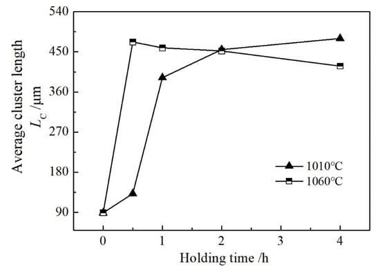 For the solution annealing condition of 1010 °C, the low deformation storage energy produced by hot rolling will first promote the GB migration and recrystallization initiation, resulting in the formation of abundant Σ3n boundaries and local clusters (Figure 1 vs. Figure 2a and Figure 3a). With the grain growth and gradual migration of GBs at longer holding time, the character distribution of Σ3n boundaries are further optimized to evolve into larger TRDs, and the connection network of RHAGBs is continuously interrupted, presenting increased values of LC and J2/(1 − J3), as shown in Figure 4 and Figure 5. For the length fraction of Σ3n boundaries (FΣ), since the increase in Σ3n mainly occurs in the first stage (I) mentioned above, the extension of holding time has little effect on it, that is, the value of FΣ changes slightly.