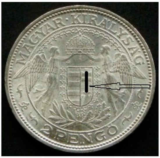 Electroconductive copper with a purity of 99.5% was used as the test material for comparison, and as the base material, the coins or other utility objects made of the Ag–Cu alloy with a content of 50–99.99% Ag, Table 1. Since for material reasons (except for samples 6, 9, 16) it was not possible to cut the samples, the hardness was measured on their surface, if possible on the most convex part (that is, where the smallest deformation was assumed, e.g., Figure 1 and Figure 2 (pengö, sample no. 13; 5 Kč, sample no. 16; the measurement locations are marked on the figures). Unfortunately, data on the technology/parameters of the final production operations (degree of deformation, whether the deformation was carried out cold or hot, possible heat treatment) are already practically unavailable. The content of secondary and trace elements (secondary and trace) was determined by spectral analysis with Niton XL3 Goldd and PGS 2 spectrometers. In addition to silver and copper, the samples contained Sn (up to 0.22%), Pb (up to 0.13%), Zn (up to 0.15%) and Fe (up to 0.82); some also contained traces of Au, Cd, Cr and V. Copper (sample no. 1) contained traces (up to 0.01%) of Fe, Mn, Ni, Co, Ag, Pb, Si, Sn, Ti, Zn and Al.